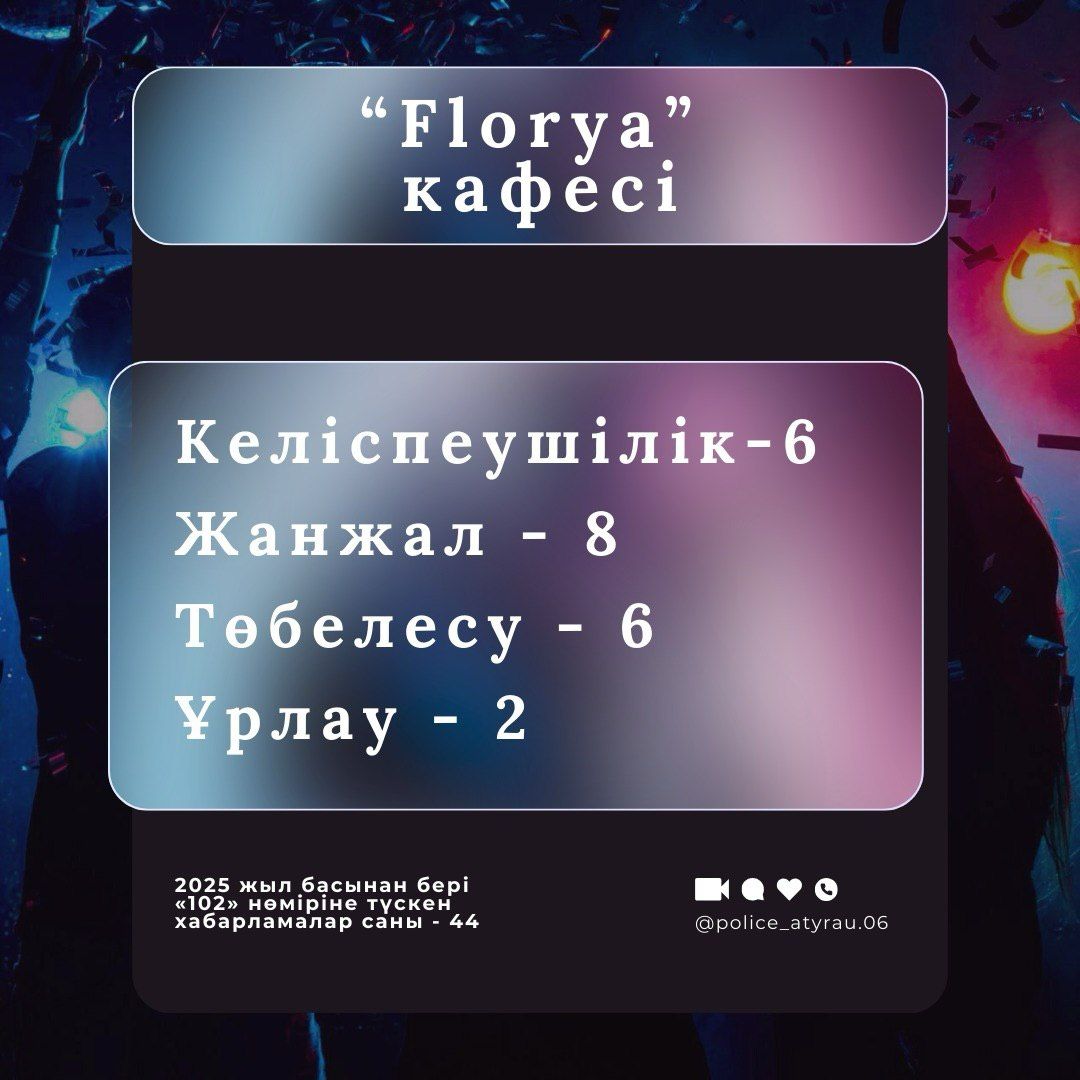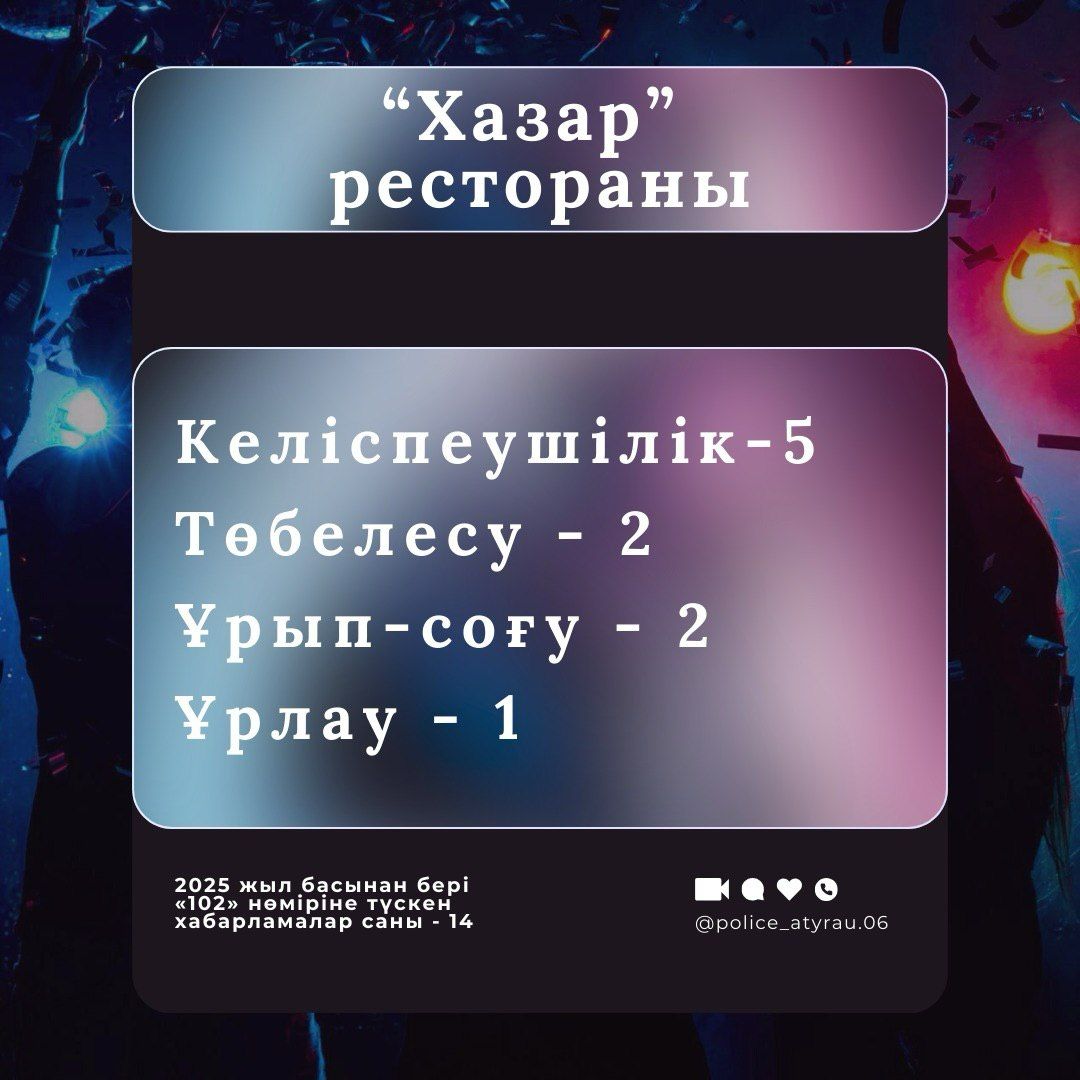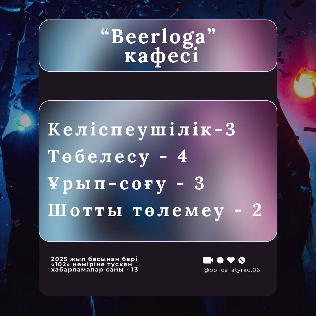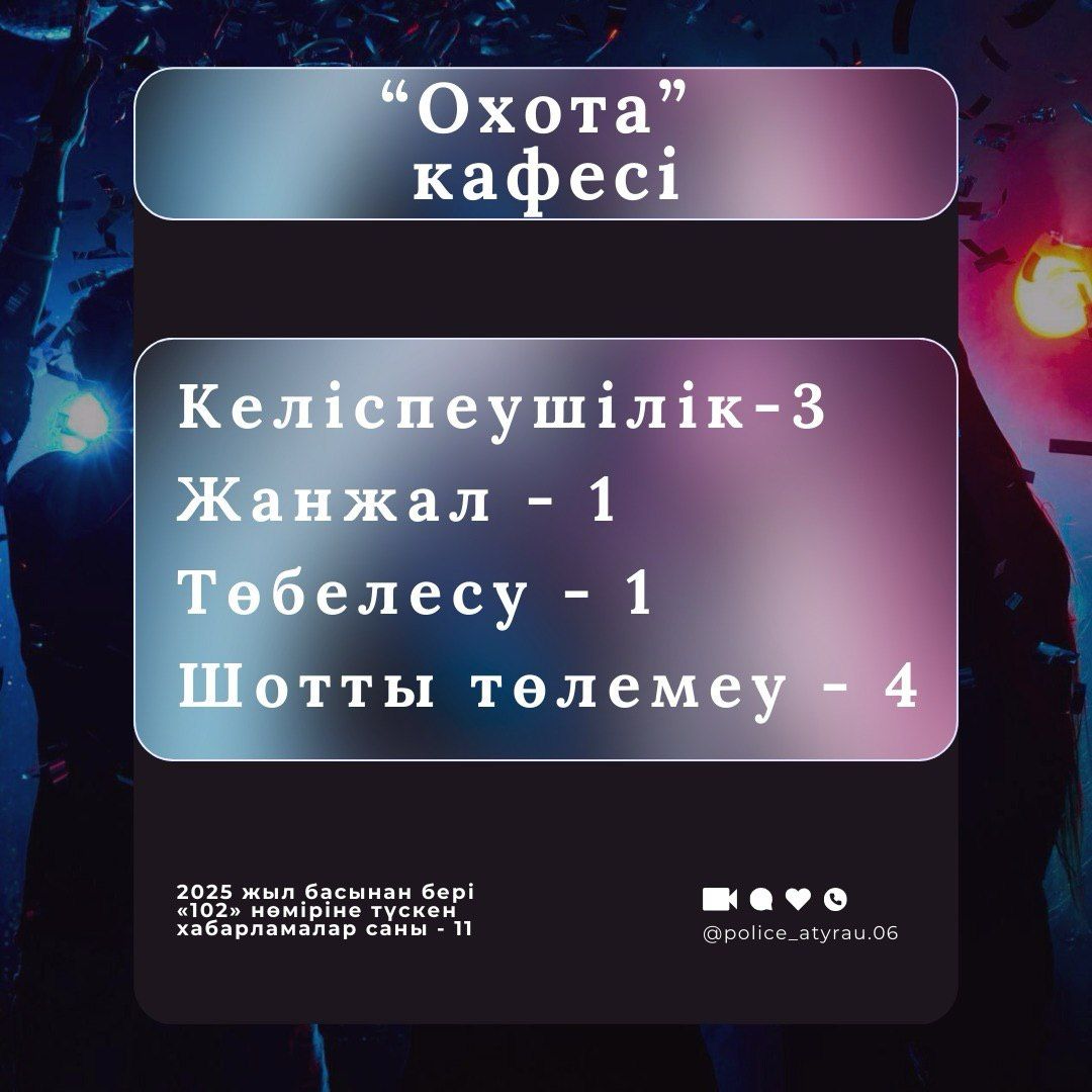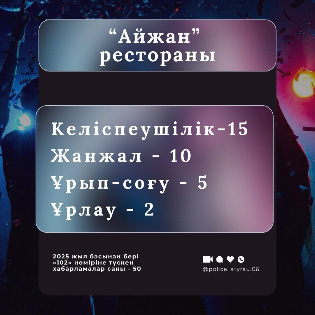 Полиция Атырау обнародовала статистику правонарушений, зафиксированных в кафе, ресторанах и караоке-заведениях города с начала 2025 года.
