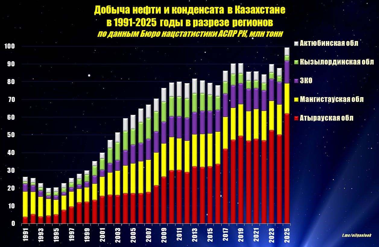 В целом представленные данные отражают сохраняющуюся высокую концентрацию нефтедобычи в западных регионах страны, прежде всего в Атырауской области, которая на протяжении многих лет остается ключевым нефтегазовым центром Казахстана.