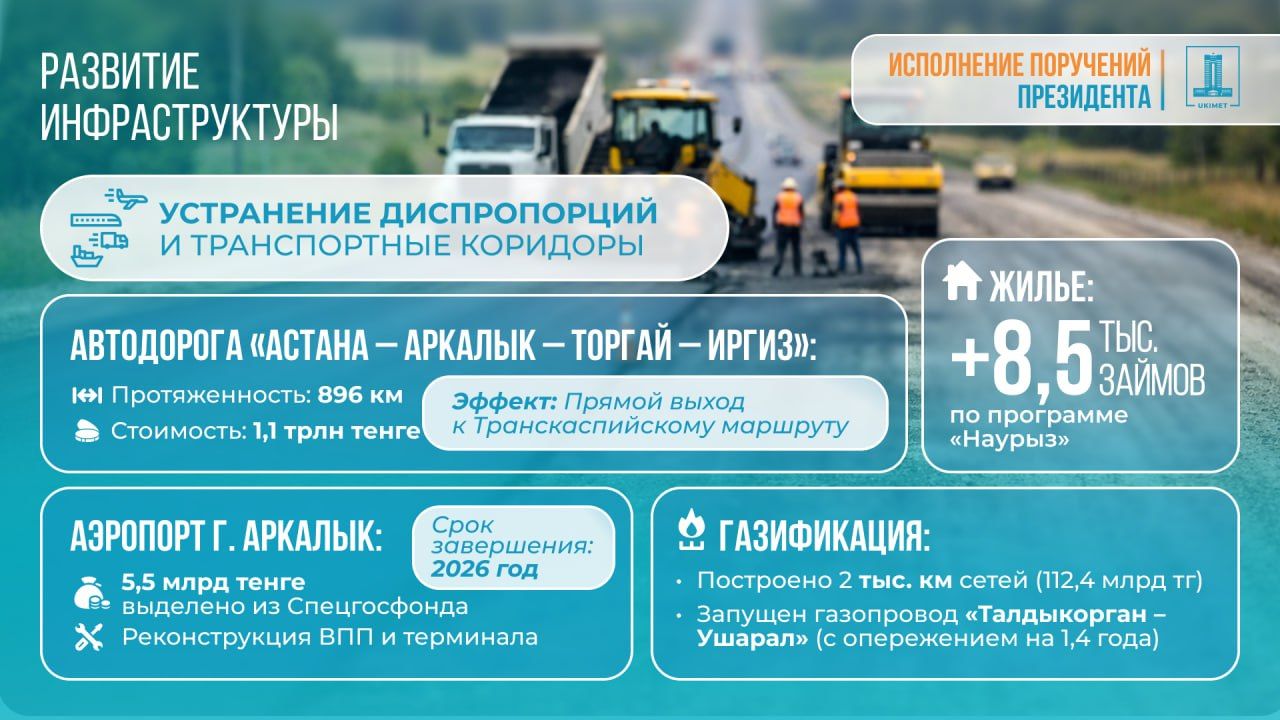 Для повышения транспортной доступности малых городов реализуется поручение Президента по восстановлению аэропорта Аркалыка. Воздушная гавань не функционировала с 1992 года. На реконструкцию взлётно-посадочной полосы и строительство нового терминала из Специального государственного фонда выделено 5,5 млрд тенге, завершение работ запланировано на 2026 год.