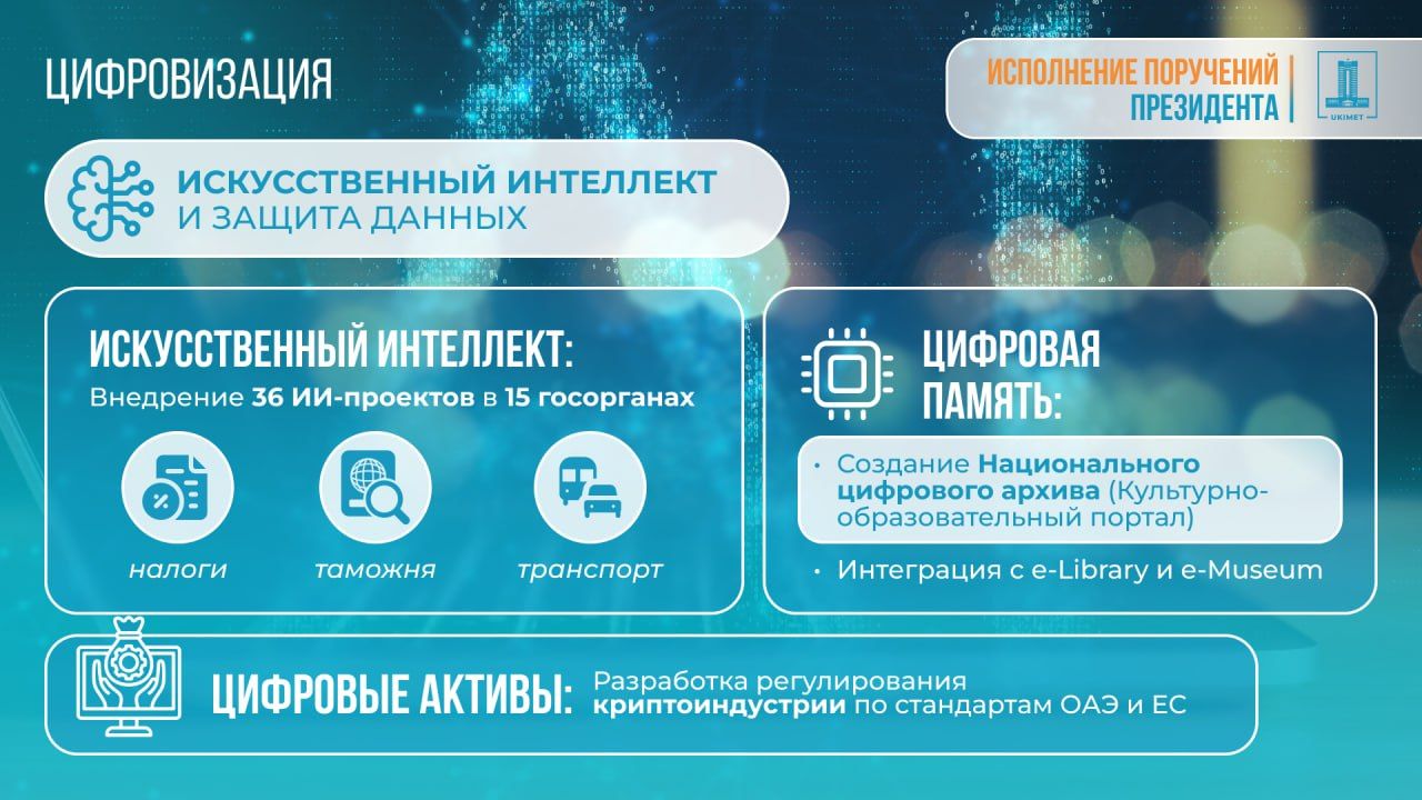 В рамках поручений IV заседания Курултая утверждён план внедрения 36 ИИ-проектов в 15 центральных госорганах — от налогового администрирования до аналитики в транспорте и науке.
