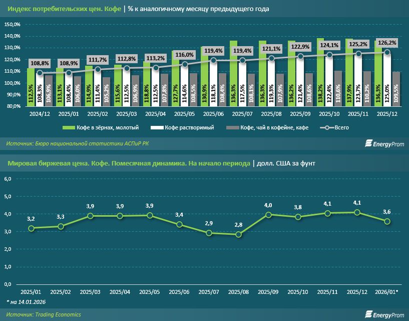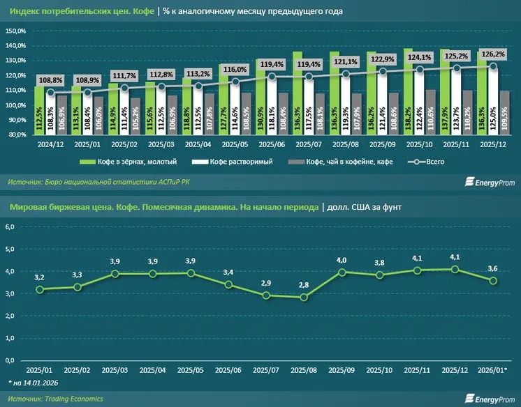 Эксперты отмечают, что резкий рост цен не является особенностью внутреннего рынка Казахстана — кофе дорожает по всему миру. Согласно данным международного портала Trading Economics, в декабре 2025 года фунт кофе на мировой бирже стоил 4,1 доллара США, что на 28% выше, чем в январе предыдущего года.