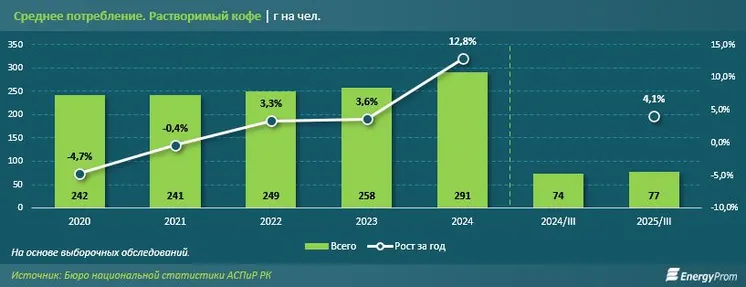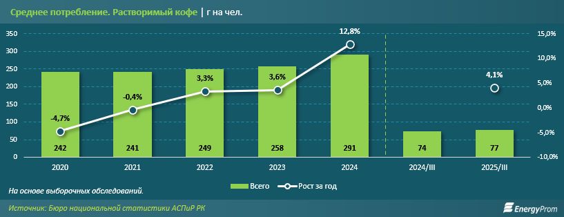 Несмотря на рост цен, казахстанцы не отказываются от кофе. По данным выборочных обследований БНС, за последние три года в стране, напротив, увеличилось потребление растворимого кофе. В третьем квартале прошлого года среднее потребление составило 77 граммов на человека, что на 4,1% больше, чем годом ранее.