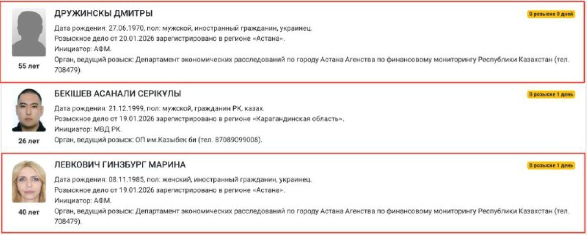 Казахстан объявил в международный розыск новых фигурантов резонансного уголовного дела, связанного с организацией незаконного онлайн-казино. Речь идет о гражданине США Дмитрие Дружинском и гражданке Украины Марине Левкович, которые, по версии следствия, причастны к выводу средств на запрещённые в стране игорные онлайн-платформы, сообщает в своем telegram-канале Михаил Казачков.