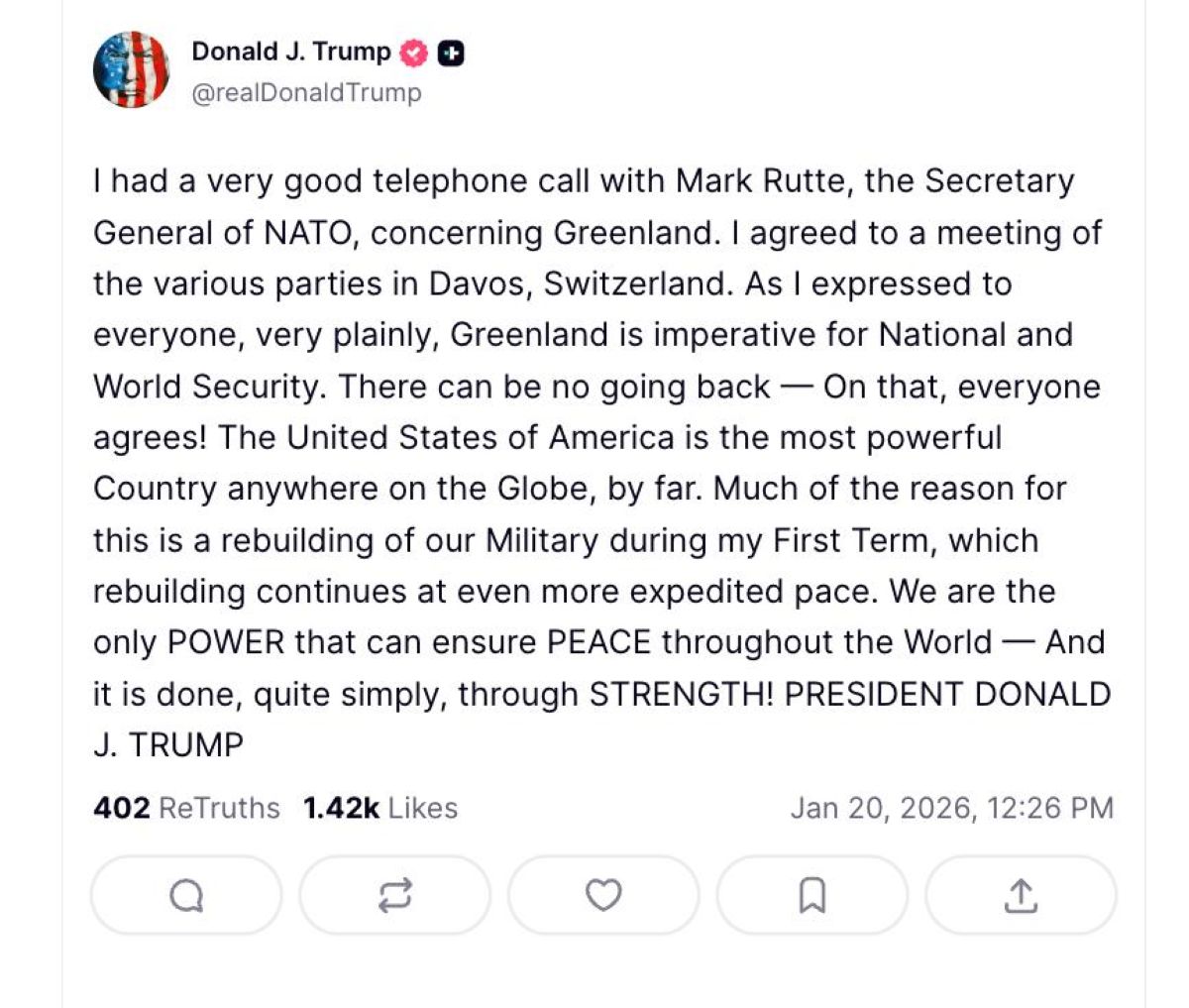 «Соединённые Штаты Америки — самая могущественная страна на планете, с большим отрывом. США — единственная держава, которая может обеспечить мир во всём мире. И это делается очень просто — посредством силы», — написал президент.