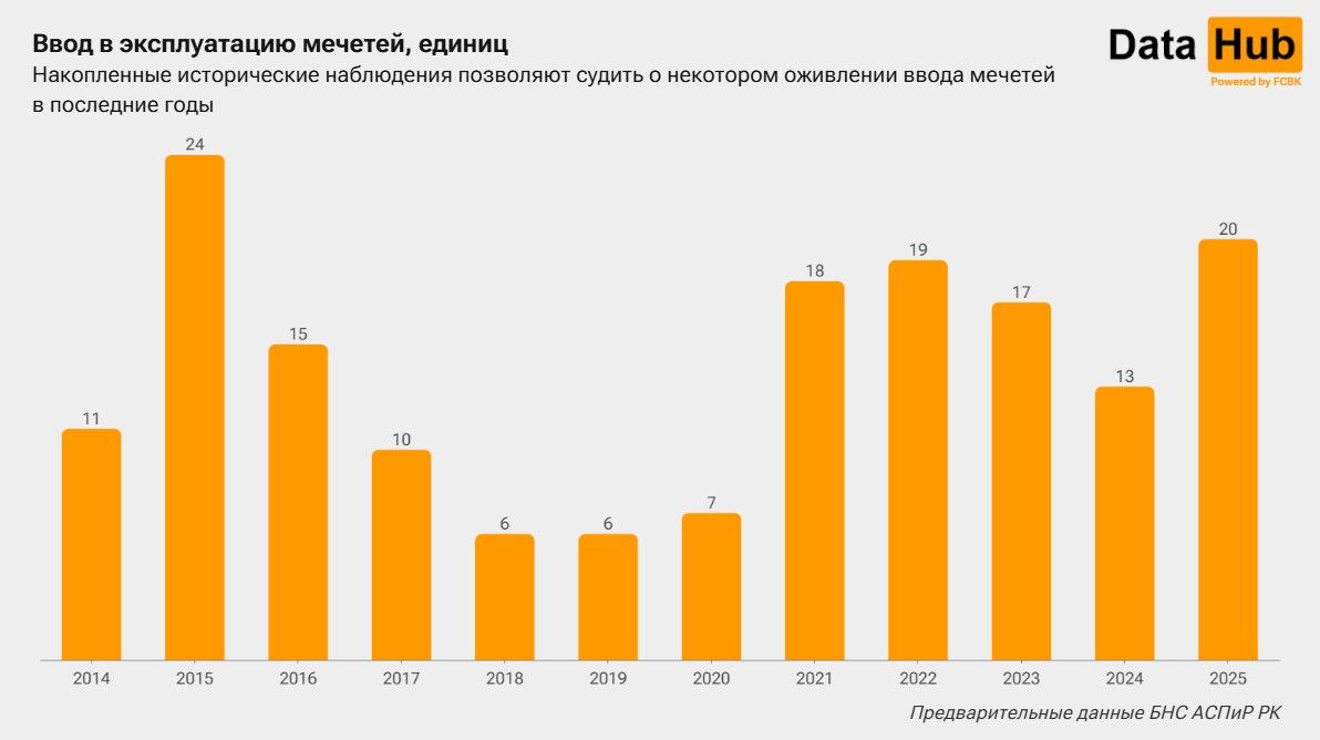 В Казахстане в 2025 году в эксплуатацию было введено 20 мечетей, что на 54% больше, чем годом ранее, передает Data Hub с ссылкой на Бюро национальной статистики Агентства по стратегическому планированию и реформам РК.