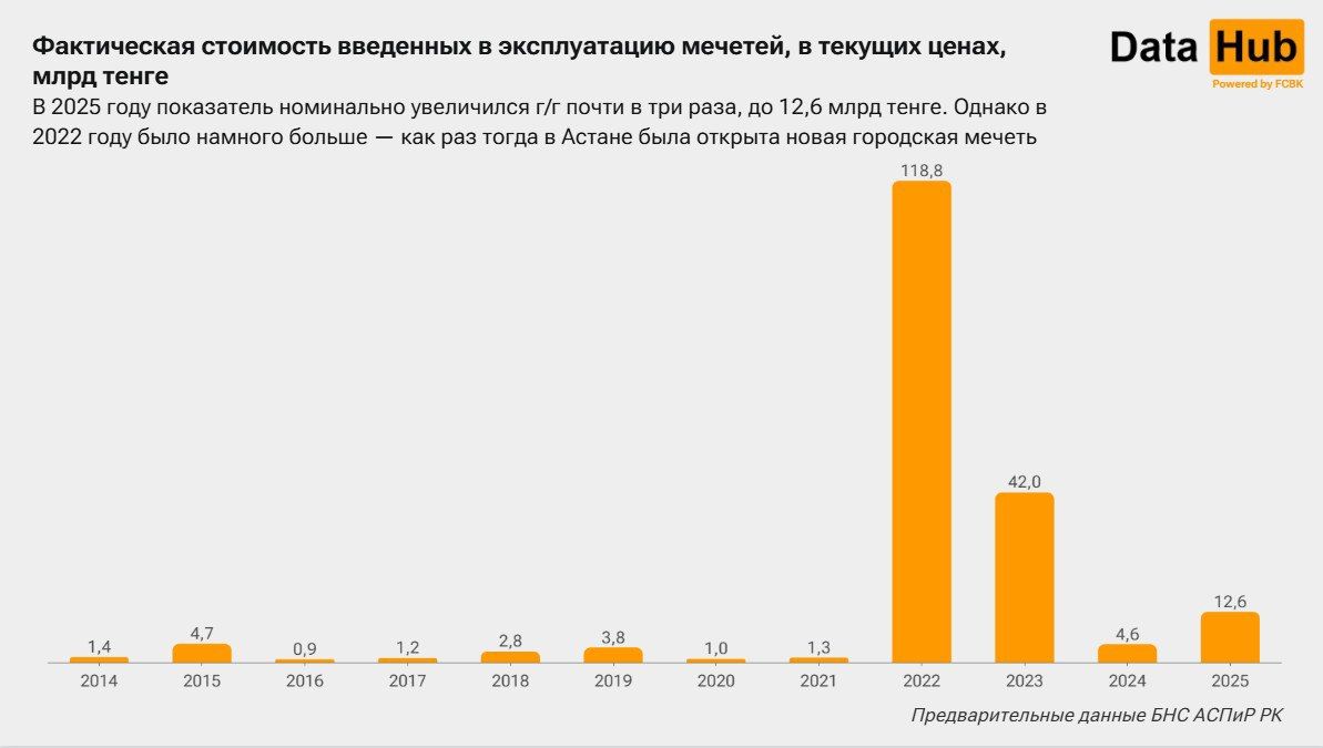 В 2025 году общий объём затрат на строительство мечетей в номинальном выражении увеличился почти в три раза по сравнению с предыдущим годом и составил 12,6 млрд тенге. Однако этот показатель не является рекордным. Так, в 2022 году фактическая стоимость введённых мечетей достигла 118,8 млрд тенге, из которых 97% (114,9 млрд тенге) пришлось на Астану — в связи с открытием главной городской мечети, крупнейшей в Центральной Азии.