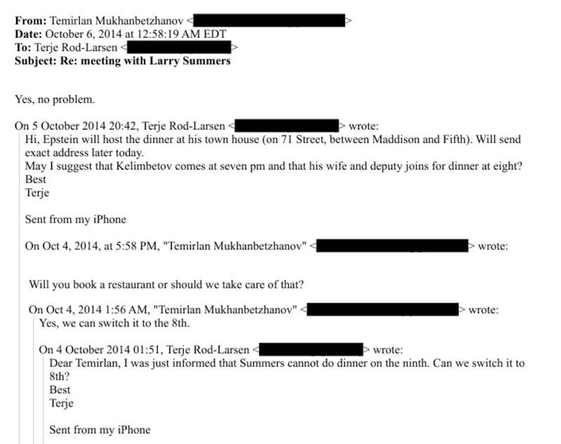 Также во встрече участвовали Лоуренс Саммерс, экс-министр финансов США, супруга Келимбетова и его заместитель. Посредником был норвежский дипломат и друг Эпштейна Терье Рёд-Ларсен, который переписывался с самим Келимбетовым и его помощником Темирланом Муханбетжановым.