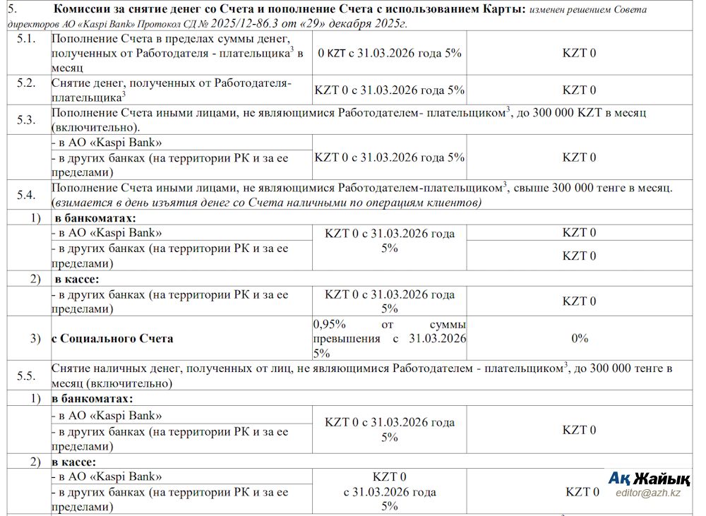 Об этом стало известно из приложения №1 к Правилам об общих условиях проведения операций АО «Kaspi Bank», опубликованного на сайте финансовой организации.