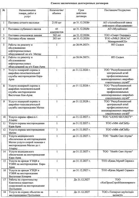 Также заключены долгосрочные договоры на охранные услуги — как на месторождениях, так и в офисе компании в Атырау. До конца 2027 года действуют контракты на медицинское обеспечение производственных площадок, аренду установок погружных центробежных и электровинтовых насосов, а также на строительство комплекса защиты Прорвинской группы месторождений.