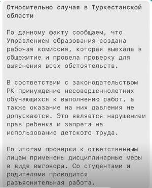 Проверкой обстоятельств инцидента займётся управление образования Туркестанской области. В комитете уточнили, что комиссия проведёт проверку общежития, включая условия проживания и соблюдение прав учащихся.