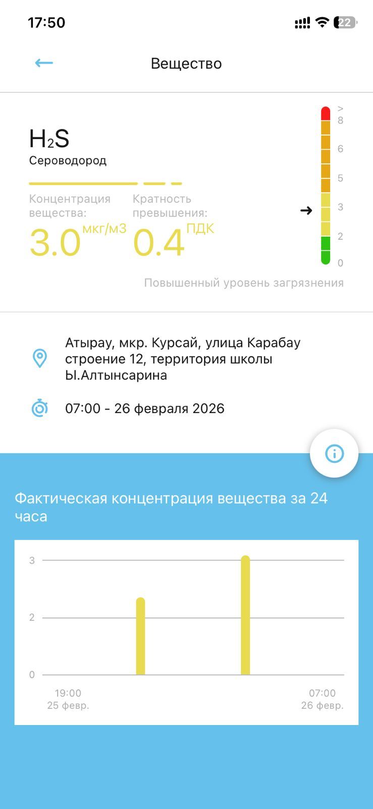 В микрорайоне Самал уровень NO₂ составил 54,6 мкг/м³, в районе городского акимата — 47,2 мкг/м³. Повышенные показатели сероводорода отмечены в Самале — 2,0 мкг/м³, а также в микрорайонах Курсай и Химпосёлок.