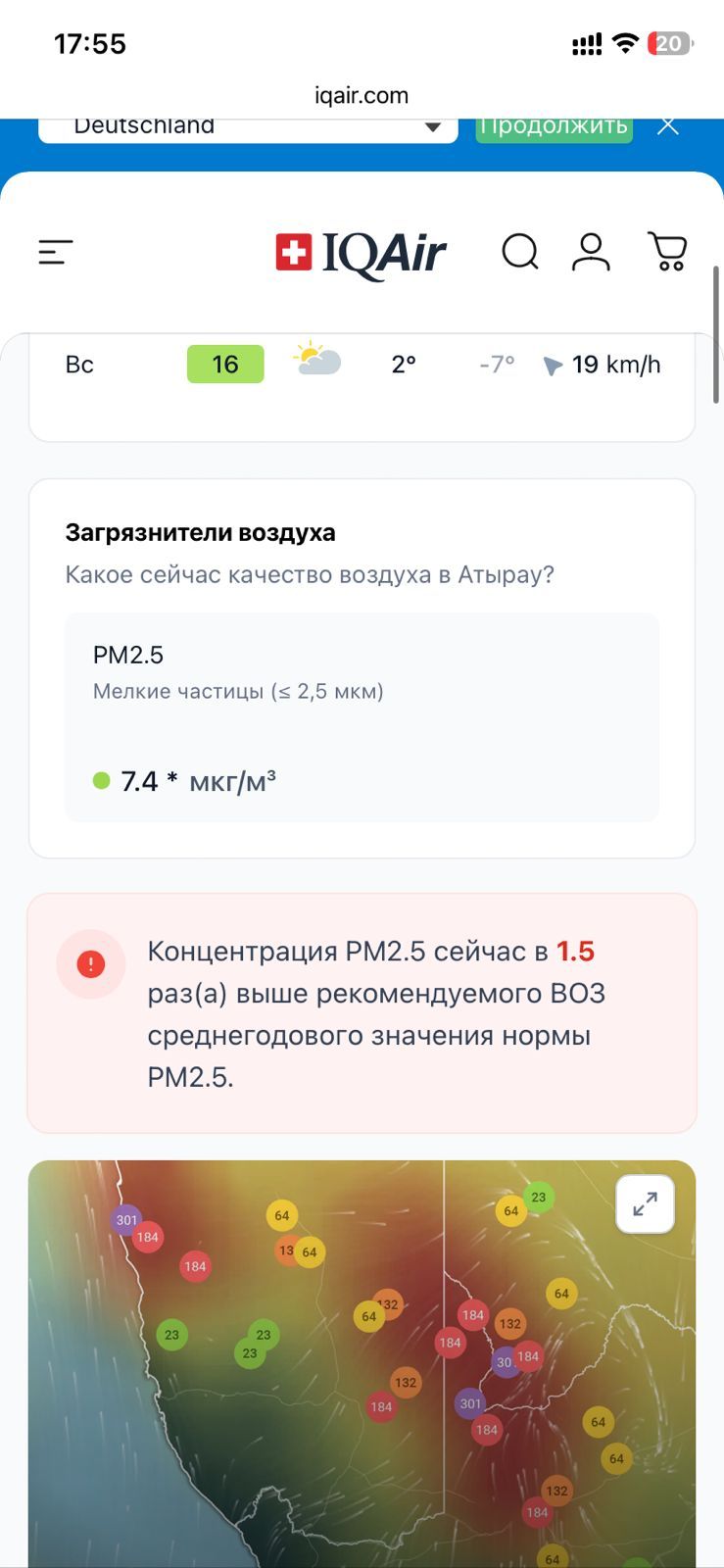 Редакция «Ак Жайык» проверила данные мониторинга качества воздуха. На платформе IQAir концентрация PM2.5 составляет 7,4 мкг/м³ — это примерно в 1,5 раза выше рекомендуемого среднегодового ориентира Всемирной организации здравоохранения. При этом показатель не относится к экстремальным значениям.