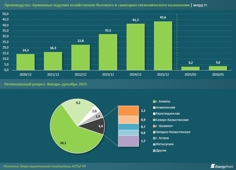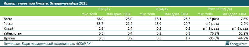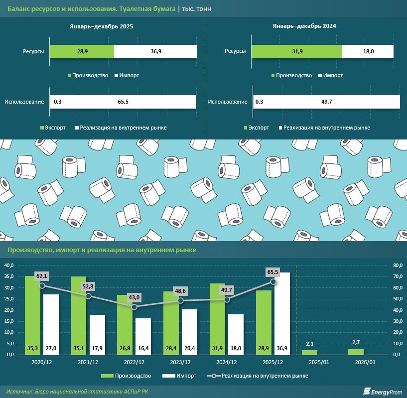 По данным Бюро национальной статистики, за 2025 год реализация туалетной бумаги в Казахстане подскочила на 31,9%, достигнув 65,5 тыс. тонн. Однако отечественные предприятия за этот же период произвели лишь 28,9 тыс. тонн продукции — это на 9,4% меньше, чем годом ранее.