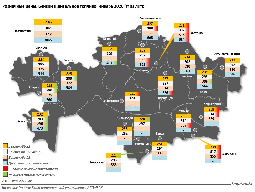АИ-95/96: Здесь лидируют Алматы (317 тенге), Талдыкорган (314 тенге) и Петропавловск (308 тенге).