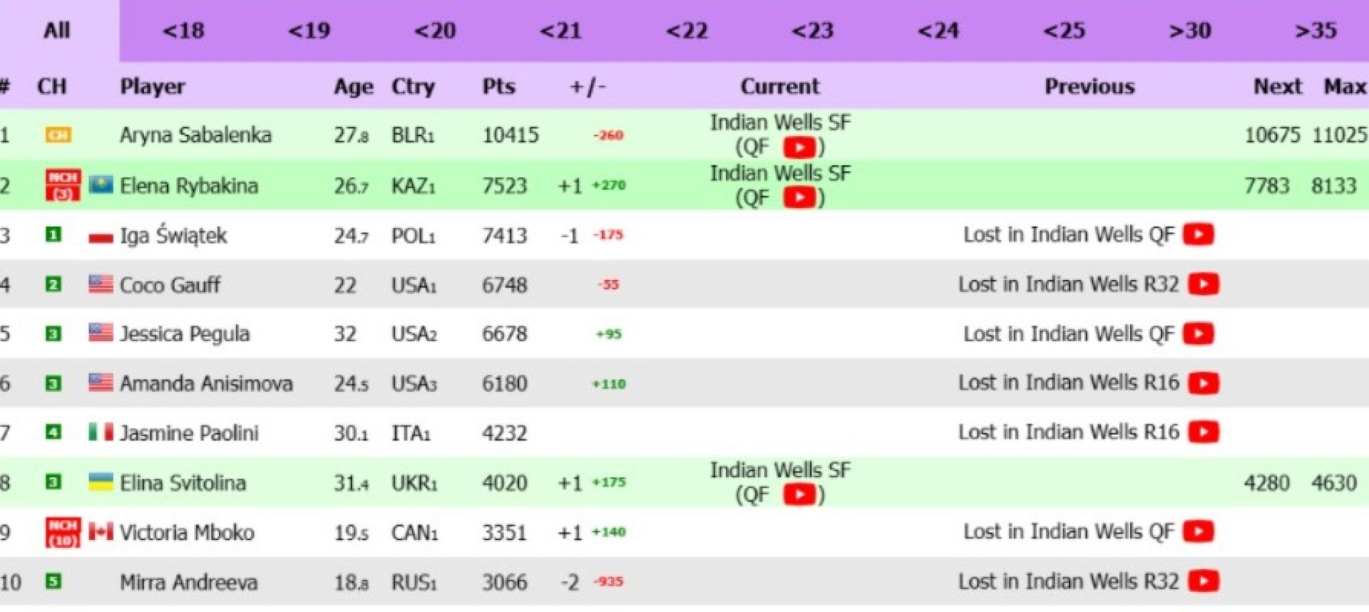 Сейчас в действующем официальном рейтинге WTA Рыбакина занимает третью строчку, однако результат в Индиан-Уэллсе изменит положение уже после обновления классификации. Лидером рейтинга по-прежнему остается Арина Соболенко.
