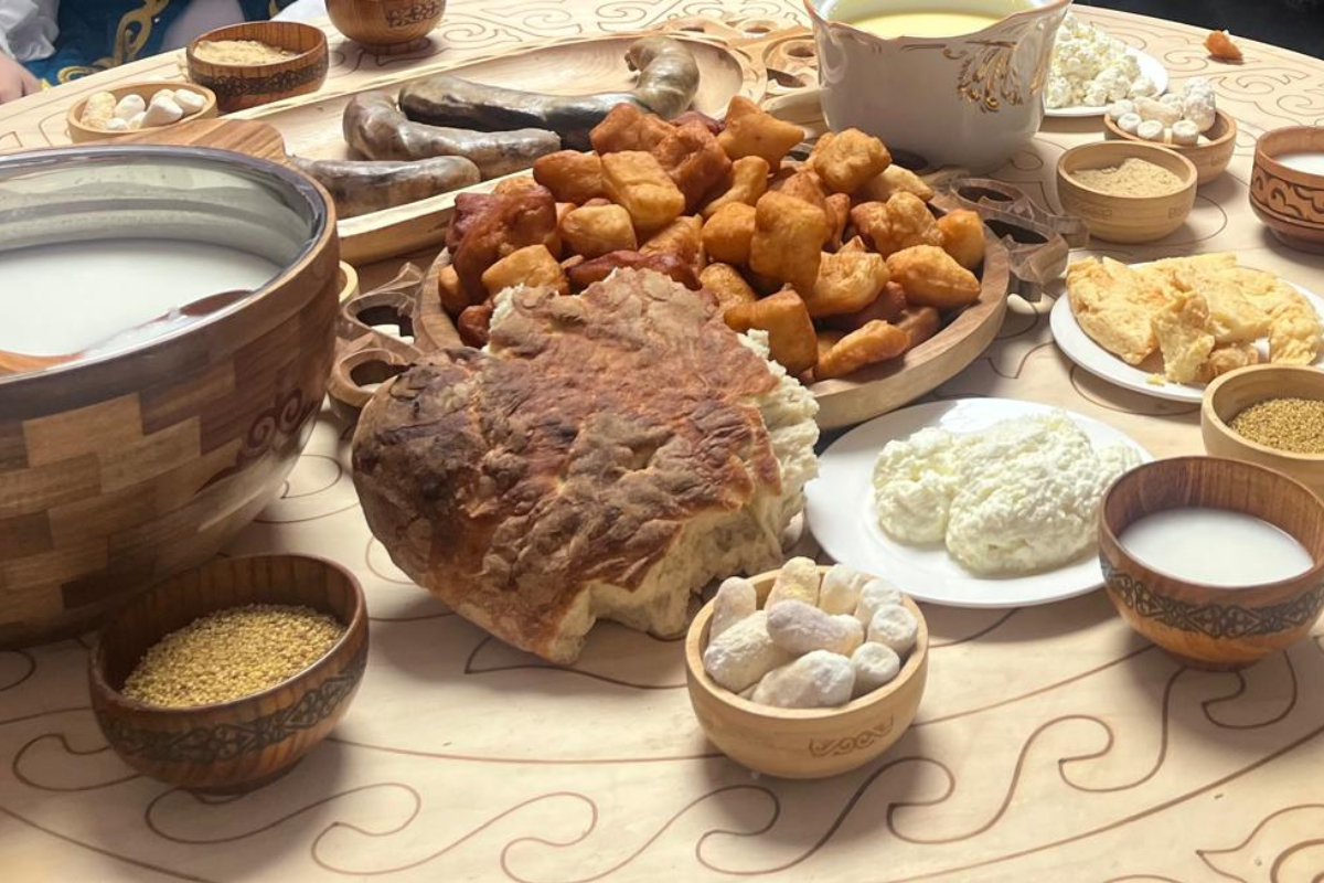 В центре поставили юрту, расстелили текемет и алаша, разложили ковры. В одном казане жарят баурсаки, в другом варят наурыз коже. Столы накрывают просто и по-настоящему: угощения со сливочным маслом, сыром, куртом и сүзбе. Люди заходят, здороваются, садятся рядом, угощаются и желают друг другу счастливой жизни.