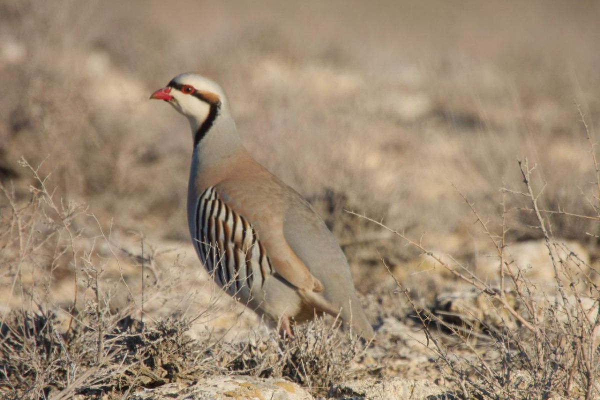 Еще один мастер маскировки, заснятый специалистами, — каменная куропатка, или кеклик. Эта птица, которую легко узнать по серому телу, характерной чёрной «маске» с полосой через глаза, красному клюву и полосатым бокам, предпочла затаиться среди травы и кустарника. Кеклики — наземные жители, приспособленные к засушливым районам: они быстро передвигаются по земле и поднимаются в воздух лишь в случае крайней необходимости.