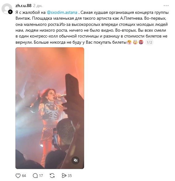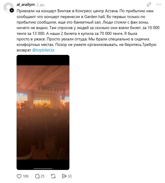 Дополнительное недовольство вызвало то, что в новом зале отсутствовали сидячие места, несмотря на то, что часть билетов продавалась как посадочные — стоимостью до 35 тысяч тенге. В итоге зрителям пришлось стоять весь концерт.