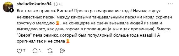 Также гости мероприятия отметили проблемы со звуком, которые, по их словам, долго не удавалось настроить. Некоторые зрители покинули выступление раньше окончания.