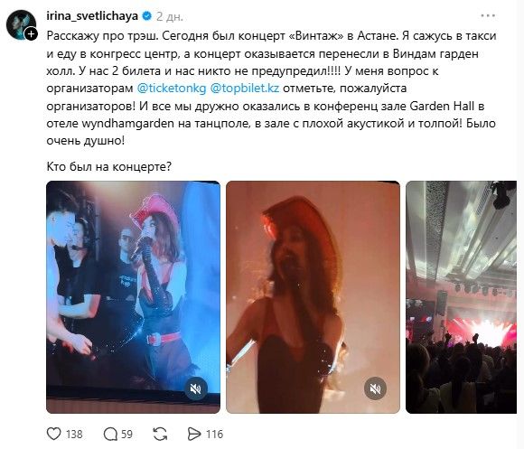 Изначально концерт с участием солистки Анна Плетнёва планировался в Конгресс-центре столицы, рассчитанном примерно на 3,5 тысячи человек. Однако, по данным источников, зал не удалось заполнить, и организаторы в последний момент перенесли мероприятие в отель Wyndham Garden Astana, где вместимость составляет около 800 человек.