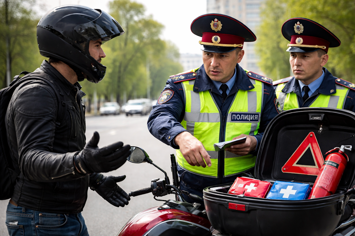 Поводом для спора стало то, что, согласно действующим Правилам дорожного движения Казахстана, для обычного двухколесного мотоцикла аптечка, знак аварийной остановки и огнетушитель не предусмотрены в обязательном перечне. Аптечка и знак аварийной остановки требуются только для мотоцикла с боковым прицепом, а требование об обязательном огнетушителе относится к автобусам, легковым и грузовым автомобилям, а также колесным тракторам.