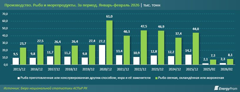 По данным аналитиков Energyprom.kz, за январь–февраль текущего года отечественные предприятия произвели 8,1 тыс. тонн свежей и мороженой рыбы — на 11,9% больше, чем годом ранее. Производство переработанной продукции и консервов также выросло на 9,2% и составило 2,3 тыс. тонн.