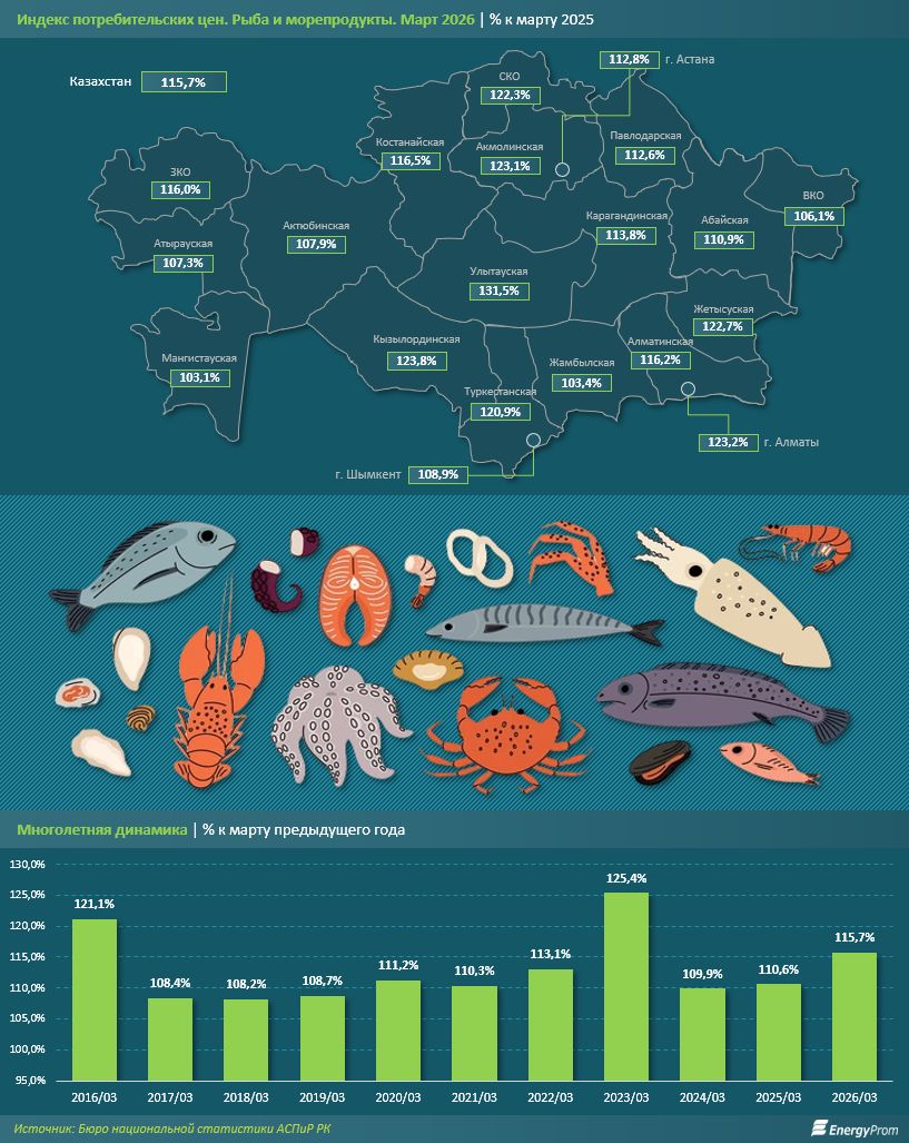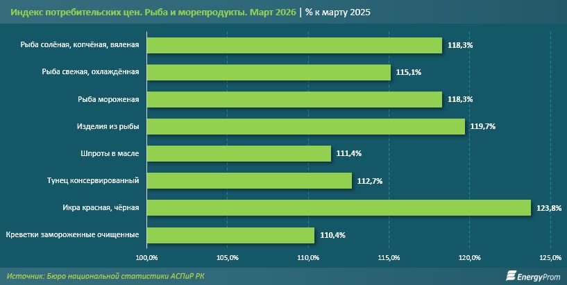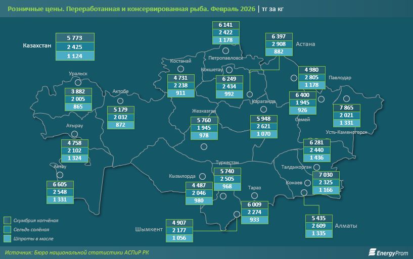 Цены на переработанную рыбу заметно различаются по регионам. Например, копченая скумбрия в среднем по стране стоит 5,8 тыс. тенге за килограмм, при этом в Усть-Каменогорске цена достигает 7,9 тыс. тенге, а в Уральске — около 3,9 тыс. тенге.