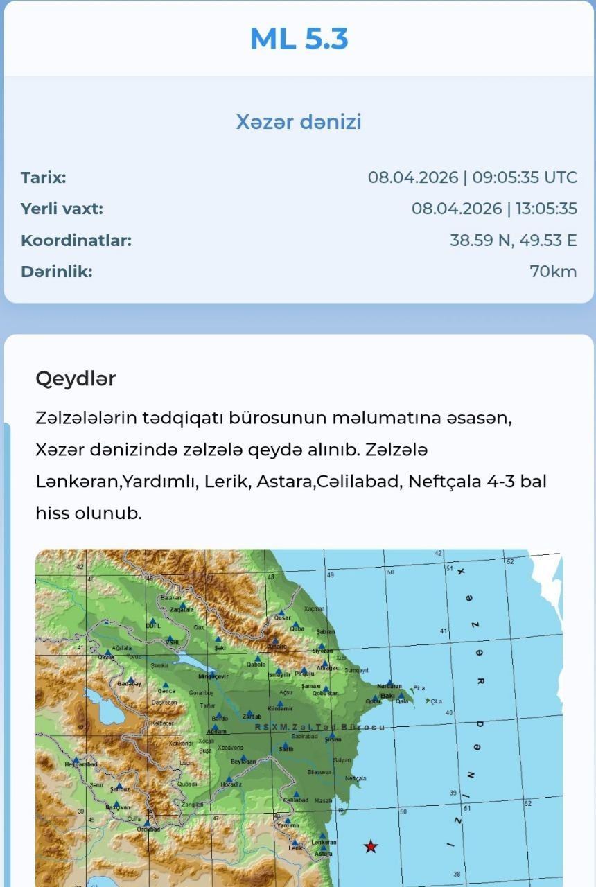 Согласно информации, подземные толчки были зафиксированы в 14:05 по времени Астаны и ощущались в районах Ленкорань, Ярдымлы, Лерик, Астара, Джалилабад и Нефтчала с силой 3–4 балла.