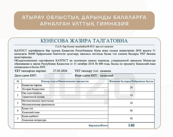 Максимальный результат, 140 баллов, показала Кенесова Жазира из Атырауской области. По четырем предметам она набрала 90 баллов, а затем воспользовалась сертификатом КАЗТЕСТ, который позволил конвертировать баллы по предмету «Казахский язык».