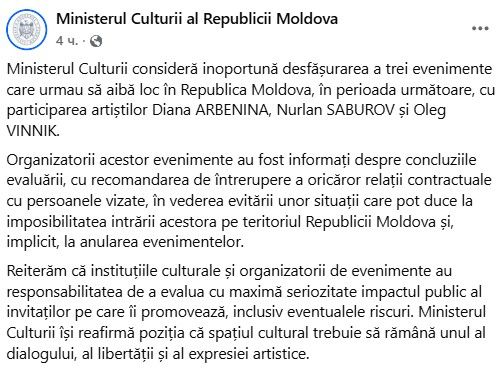 Министерство культуры страны сообщило, что считает неуместным проведение трех мероприятий с участием Дианы Арбениной, Нурлана Сабурова и Олега Винника. Организаторы уже были уведомлены о выводах оценки и получили рекомендацию прекратить любые договорные отношения с этими артистами.