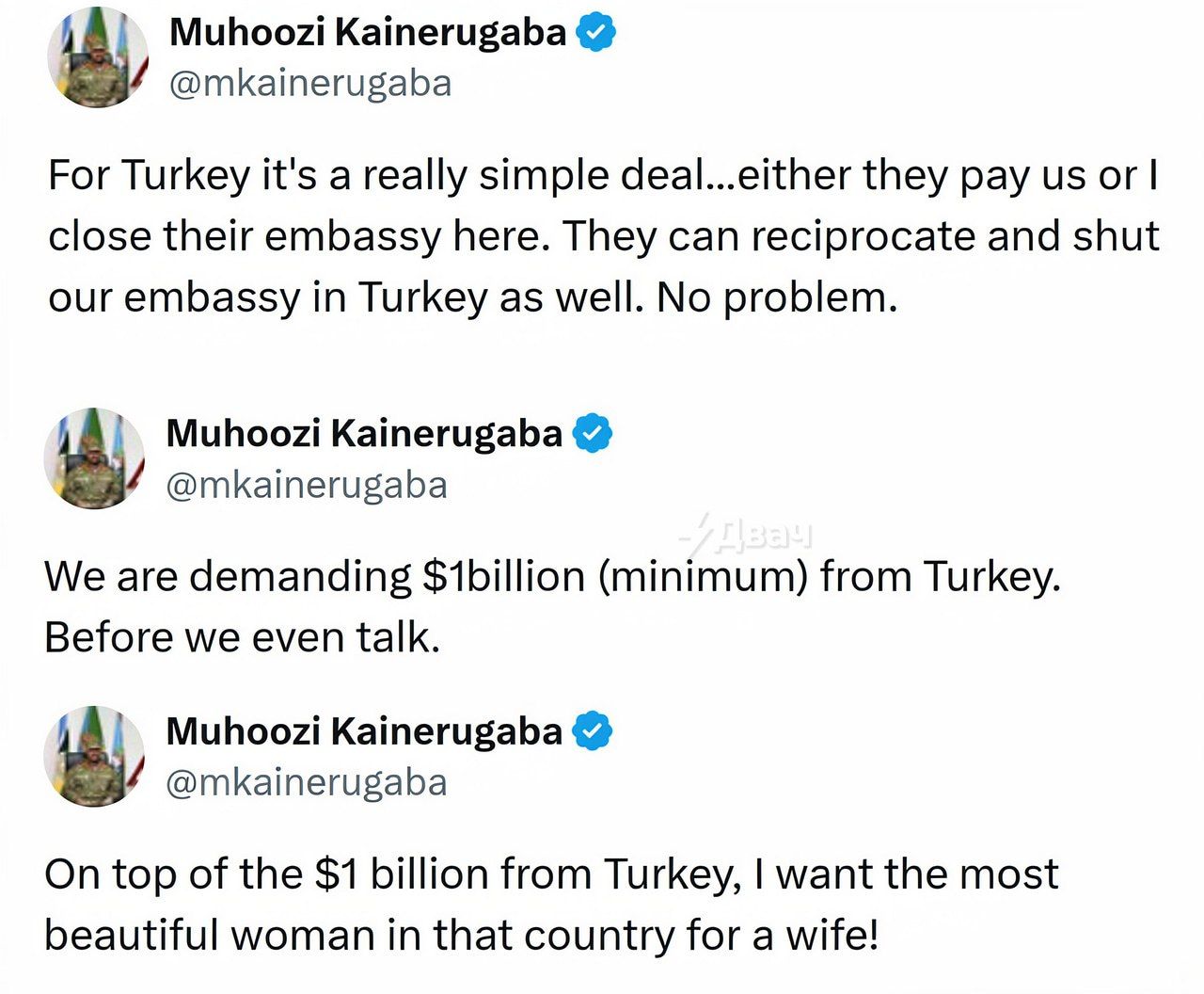В социальных сетях генерал потребовал от Анкары выплатить 1 миллиард долларов, а также предоставить ему в жёны «самую красивую женщину страны». В противном случае он пригрозил закрыть все турецкие дипломатические представительства в Уганде.