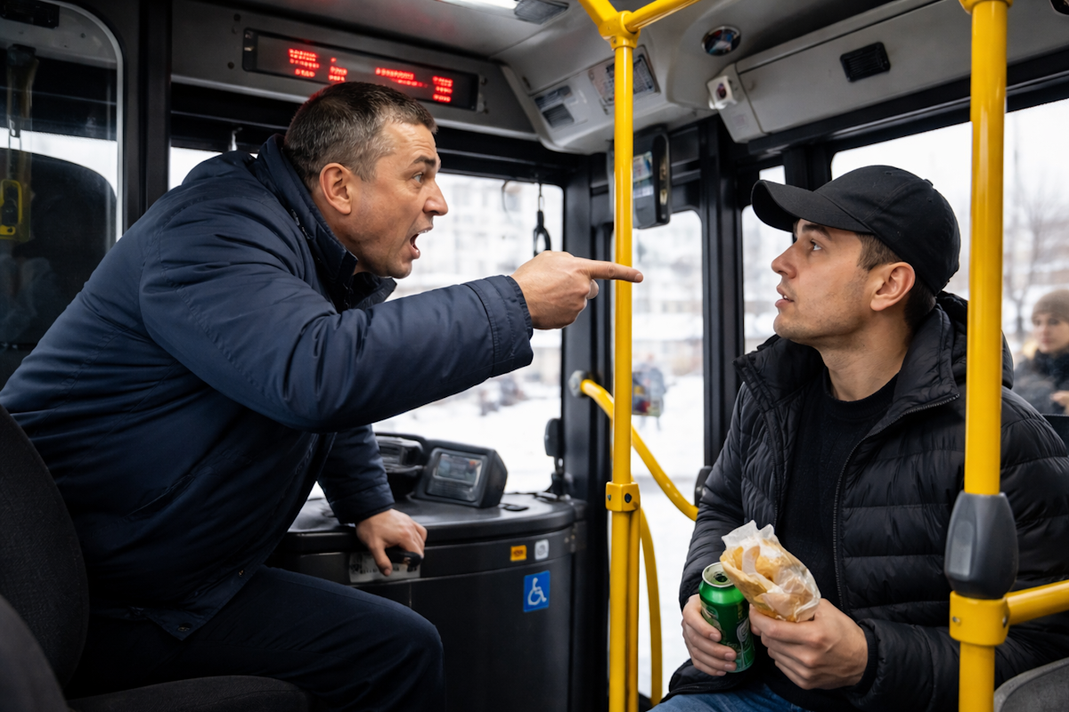 В соцсетях распространилось видео конфликта, снятого в салоне общественного транспорта. На кадрах видно, как водитель делает замечание пассажиру, который ел в автобусе, а затем переходит на оскорбления и требует, чтобы тот вышел.