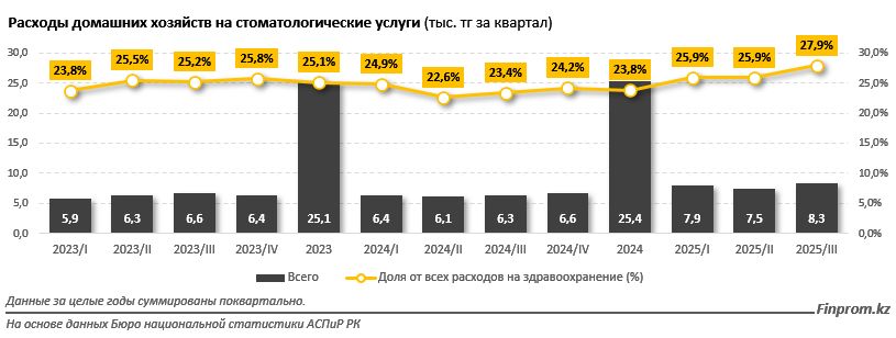 По данным Бюро национальной статистики, в 2025 году расходы домохозяйств на стоматологию выросли. В третьем квартале семьи тратили в среднем 8,3 тыс. тенге — на 30,9% больше, чем годом ранее.