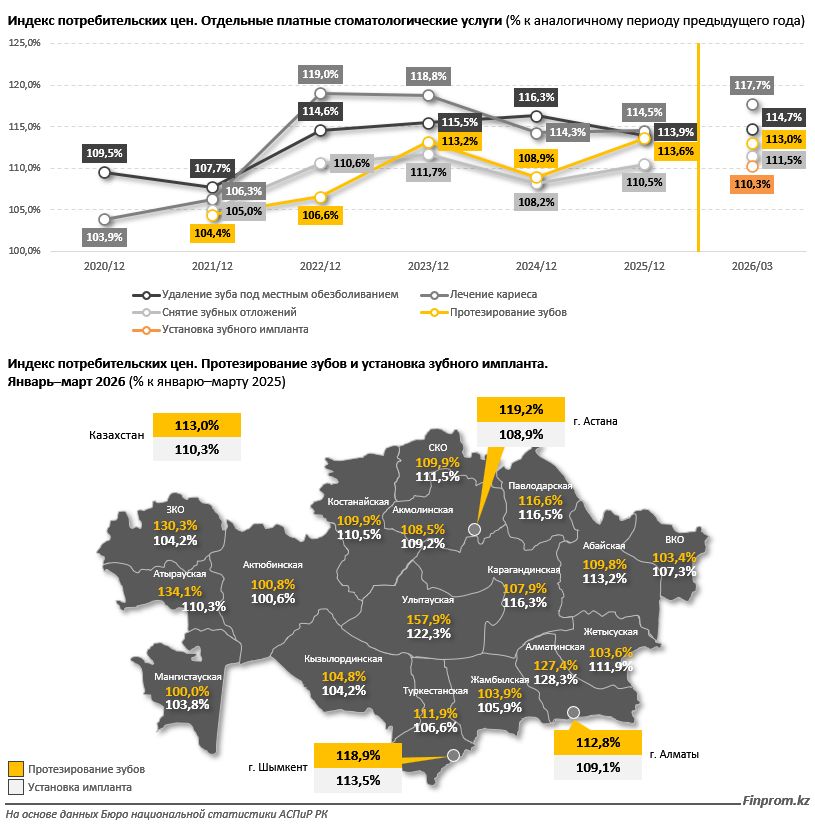 В 2026 году рост цен продолжился. За январь–март стоимость имплантации увеличилась на 10,3% в годовом выражении. При этом в отдельных регионах динамика заметно различается: в Алматинской области рост составил 28,3%, тогда как в Актюбинской — менее 1%.