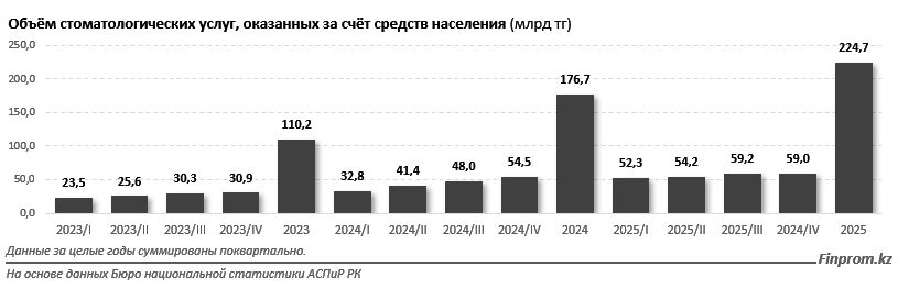 В целом объем платных стоматологических услуг в Казахстане достиг 224,7 млрд тенге за год, что на 27,2% больше по сравнению с предыдущим периодом.