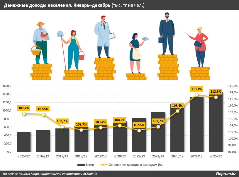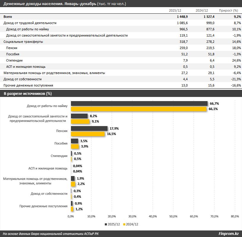 По итогам 2025 года средний денежный доход на душу населения составил 1,5 млн тенге, что на 9,2 процента больше, чем годом ранее.