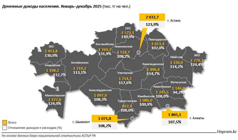 Самые высокие доходы зафиксированы в Астане и Карагандинской области, где показатель составил по 2 млн тенге на человека, а также в Алматы — 1,9 млн тенге. В то же время в Туркестанской области доход на душу населения составил всего 922,4 тыс. тенге, то есть более чем в два раза меньше.