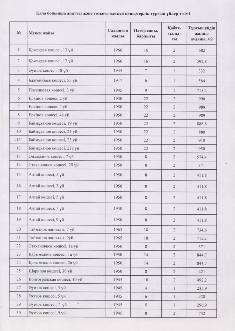 Если раньше речь шла о 225 многоэтажках, то теперь в перечне — 90 аварийных и ветхих домов, отобранных по итогам анализа; этот список направлен в областной акимат, а власти параллельно ведут переговоры с потенциальными инвесторами.