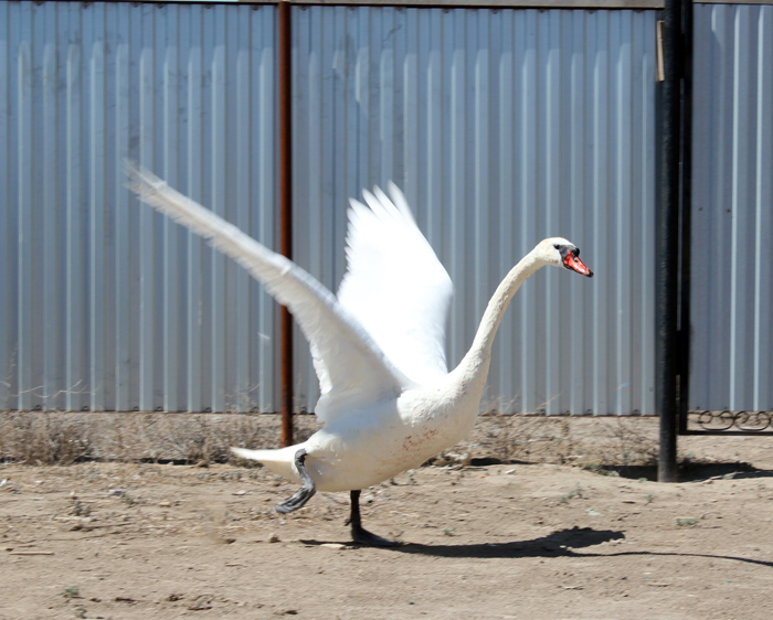 Тогда мы сами отправились спасать животинку, благо, помочь вызвались знакомые. Увидев приближающихся людей, лебедь занервничал, начал махать крыльями, вдруг взлетел вверх на пару метров, но потом снова опустился. Ещё минуту спустя он побежал, интенсивно замахав большими крыльями, оторвался от земли и начал набирать высоту, отдаляясь от нас всё дальше и дальше. Увы, осталось неизвестным, смог ли он надолго удержаться в воздухе или совершил вынужденную посадку где-нибудь неподалёку. Но если раненая птица попадётся кому-нибудь на глаза, в резервате «Акжайык» на этот случай посоветовали её выловить и отвезти поближе к открытому водоёму.