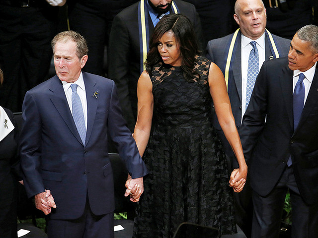 Фото: ReutersЭкс-президент США Джордж Буш-младший 12 июля на панихиде по погибшим в Далласе полицейским повел себя довольно странным образом. Во время исполнения "Боевого гимна республики" бывший американский лидер начал приплясывать. При этом Буш явно склонял к танцу тех, кто держался с ним за руки, пишет NEWSru.com.