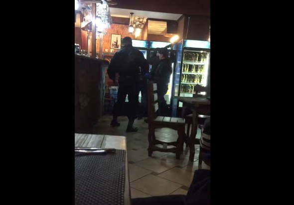 На кадрах видно, как три молодых человека, предположительно, сотрудники частного охранного агенства, избивают двух посетителей кафе. Сначала они бьют одного мужчину, тот падает на пол от удара прикладом, затем они валят на землю другого посетителя и один из охранников бьет его ногой по голове. Действие продолжается около минуты, после чего все участники потасовки удаляются на улицу.