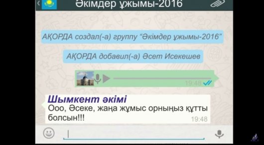 В чате акимы поздравляют Асета Исекешева с назначением на должность акима Астаны, обсуждают подготовку к Универсиаде и EXPO-2017, а также потоп на дорогах Астаны. Аким Шымкента предлагает всем заняться спортом.