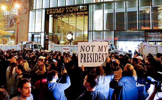 Несколько тысяч демонстрантов собрались в центре Нью-Йорка и направились к небоскребу Трамп-тауэр на Пятой авеню. Еще сотни протестующих остаются в Центральном парке.