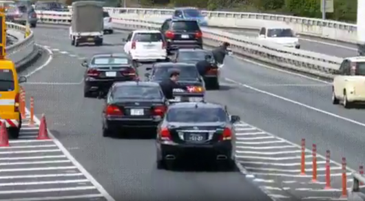 Как видно на записи, движение на участке предварительно не перекрывалось. Находчивые японцы нашли способ, позволяющий доставить высокопоставленное лицо до места назначения вовремя, не доставив неудобств другим участникам дорожного движения.