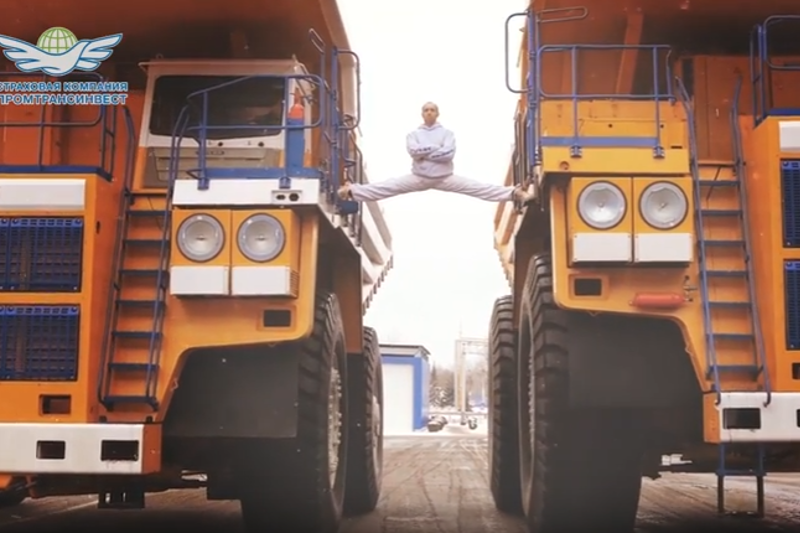 Белорус повторил известный трюк голливудского актера Жана-Клода Ван Дамма, который несколько лет назад сел на шпагат между двумя грузовиками Volvo. Блохин исполнил тот же самый трюк с карьерными самосвалами грузоподъемностью 160 и 180 тонн.