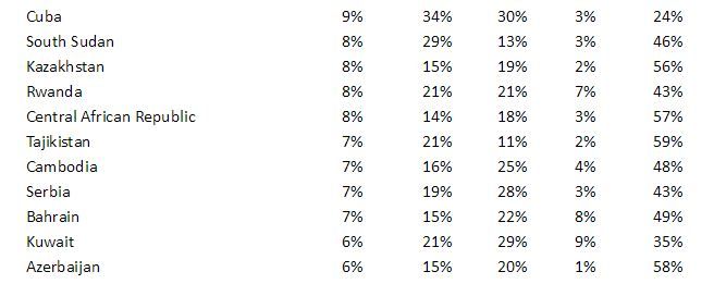 Судя по результатам, большинство опрошенных (56%) затруднилось ответить на вопрос по поводу Казахстана. 8% назвали Казахстан "врагом, 15% - "недружественной страной", 19% - "дружественной" и лишь 2% опрошенных заявили, что Казахстан является "союзником" США.
