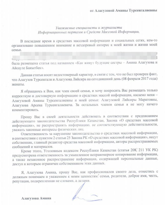 Дочь Турсенгали Алагузова Амина обратилась к СМИ с заявлением, передает Tengrinews.kz.