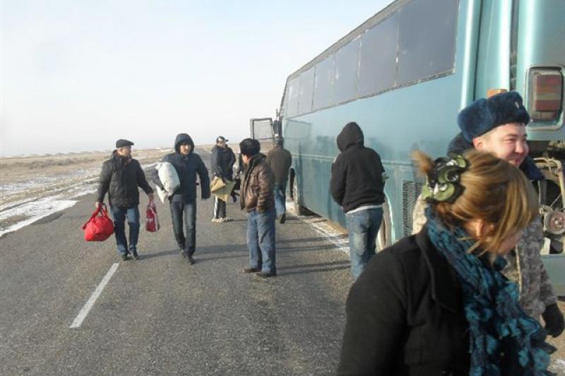 ДТП произошло на трассе между Каражалом и Карагандой. Находившиеся в салоне пятеро детей и 15 взрослых не пострадали.