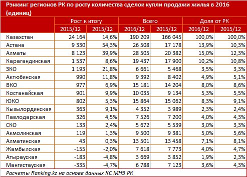 Лидером по приросту числа сделок в 2016 году стала Астана - за прошедший год здесь было заключено на 9,3 тысячи больше сделок, или на 54%, чем в 2015 году. Всего за год в столице было заключено 26,5 тысяч сделок, или 14% всего объема за 2016 год.