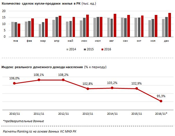 Примечательно, что увеличению сделок по купле-продаже жилья не мешает сокращение реальных доходов казахстанцев в 2016 году, зафиксированное впервые за последние 6 лет. Падение составило почти 5%.